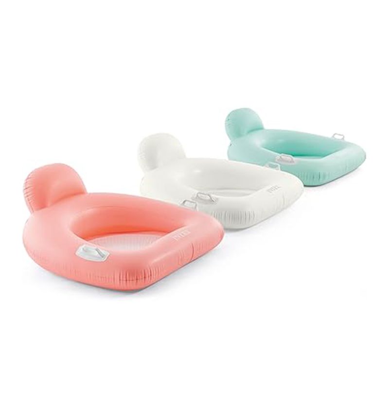 Le fauteuil de piscine Intex pastel permet de lézarder au soleil pendant des heures dans votre piscine, à la plage ou sur tout autre point d'eau. Ce dernier est fabriqué dans un vinyle confortable et résistant, qui lui offre une longue durabilité. L'assise du fauteuil est en filet, pour continuer à profiter de la fraîcheur de l'eau, sans s'immerger complètement. Un dossier et des poignées sont également présentes pour améliorer votre confort. Ce fauteuil gonflable Intex est disponible en 3 coloris : blanc, rose ou vert.